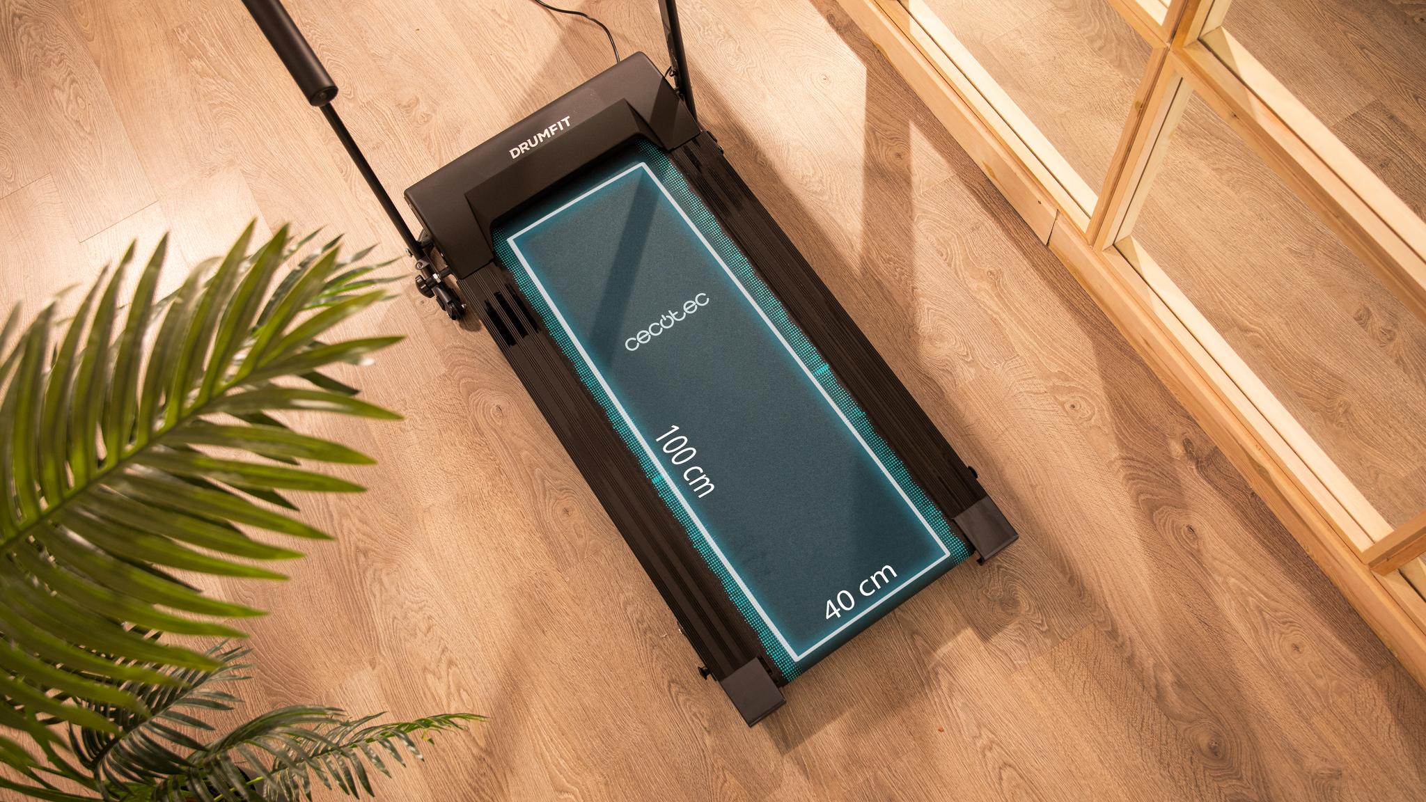 Powierzchnia do biegania o wymiarach 100×40 cm zapewnia bezpieczny i komfortowy trening, umożliwiając swobodne poruszanie się podczas ćwiczeń.