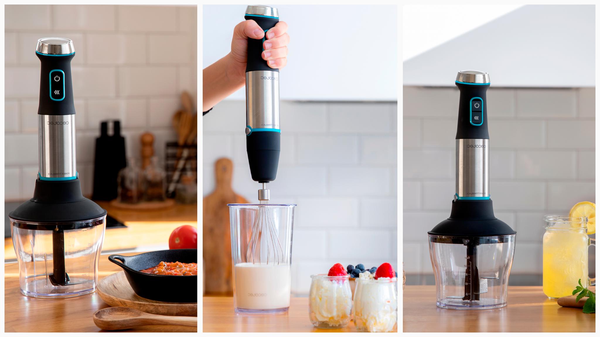 Specjalna konstrukcja końcówki zapobiega chlapaniu, zapewniając czystą przestrzeń roboczą. Dołączony pojemnik o pojemności 800 ml z pokrywką pozwala przygotować i przechować potrawy w jednym naczyniu.