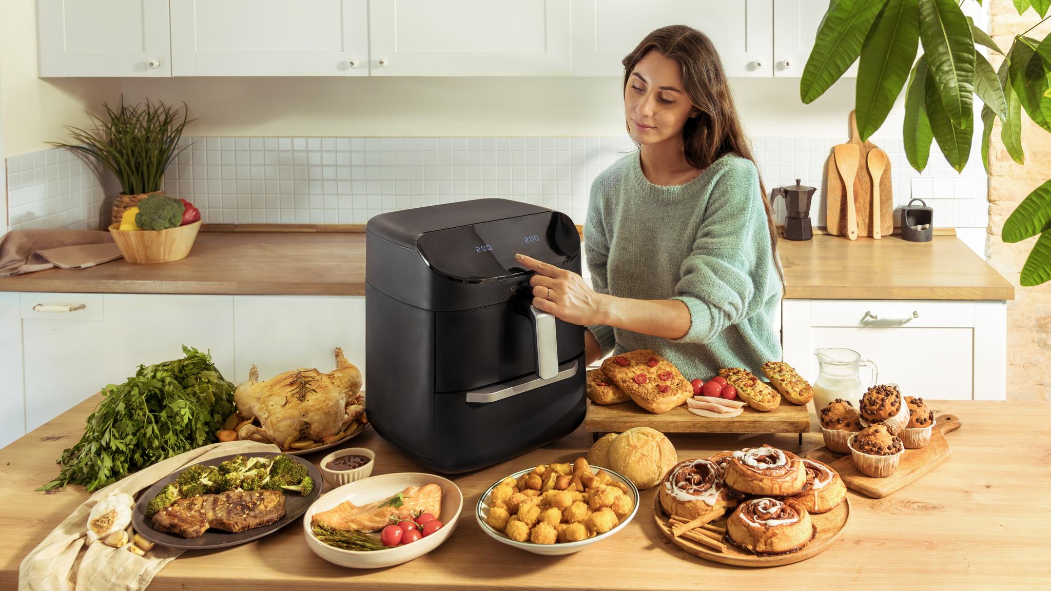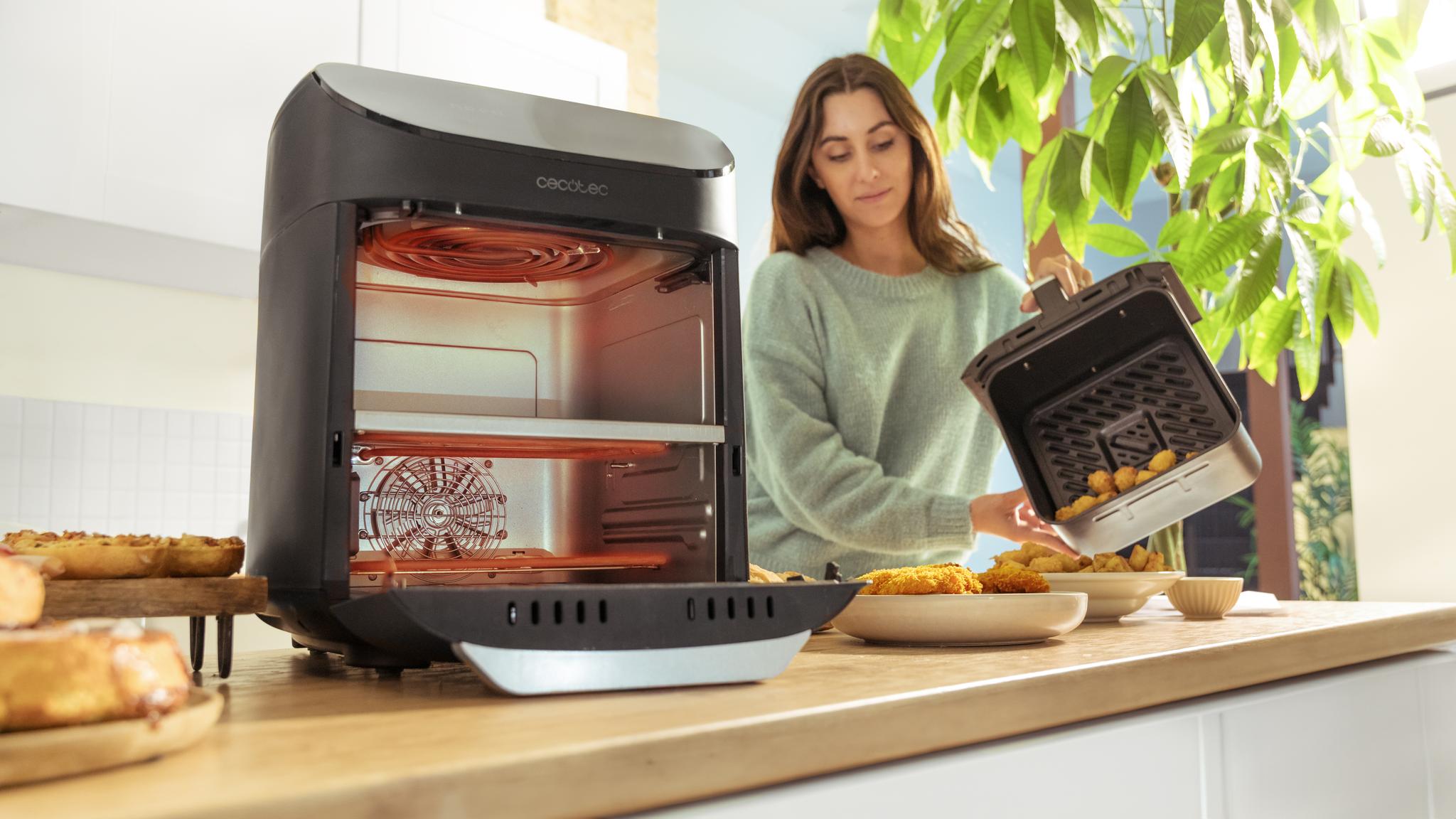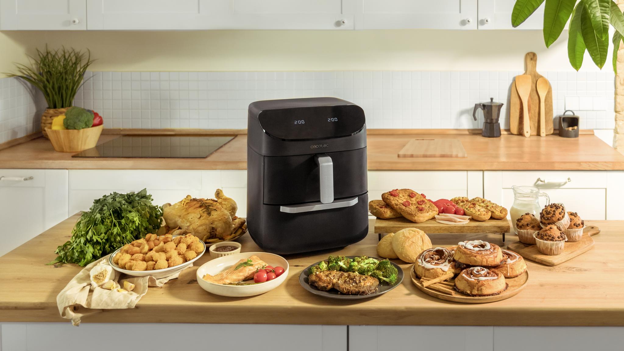 Cecofry Foodcourt 11000 Connected to nowoczesne rozwiązanie, które gwarantuje pełną wszechstronność i pozwala na jednoczesne przygotowanie dwóch potraw. Dzięki pojemności 11 litrów łączy funkcjonalność piekarnika i frytkownicy beztłuszczowej, oferując wygodę i różnorodność w jednym urządzeniu.