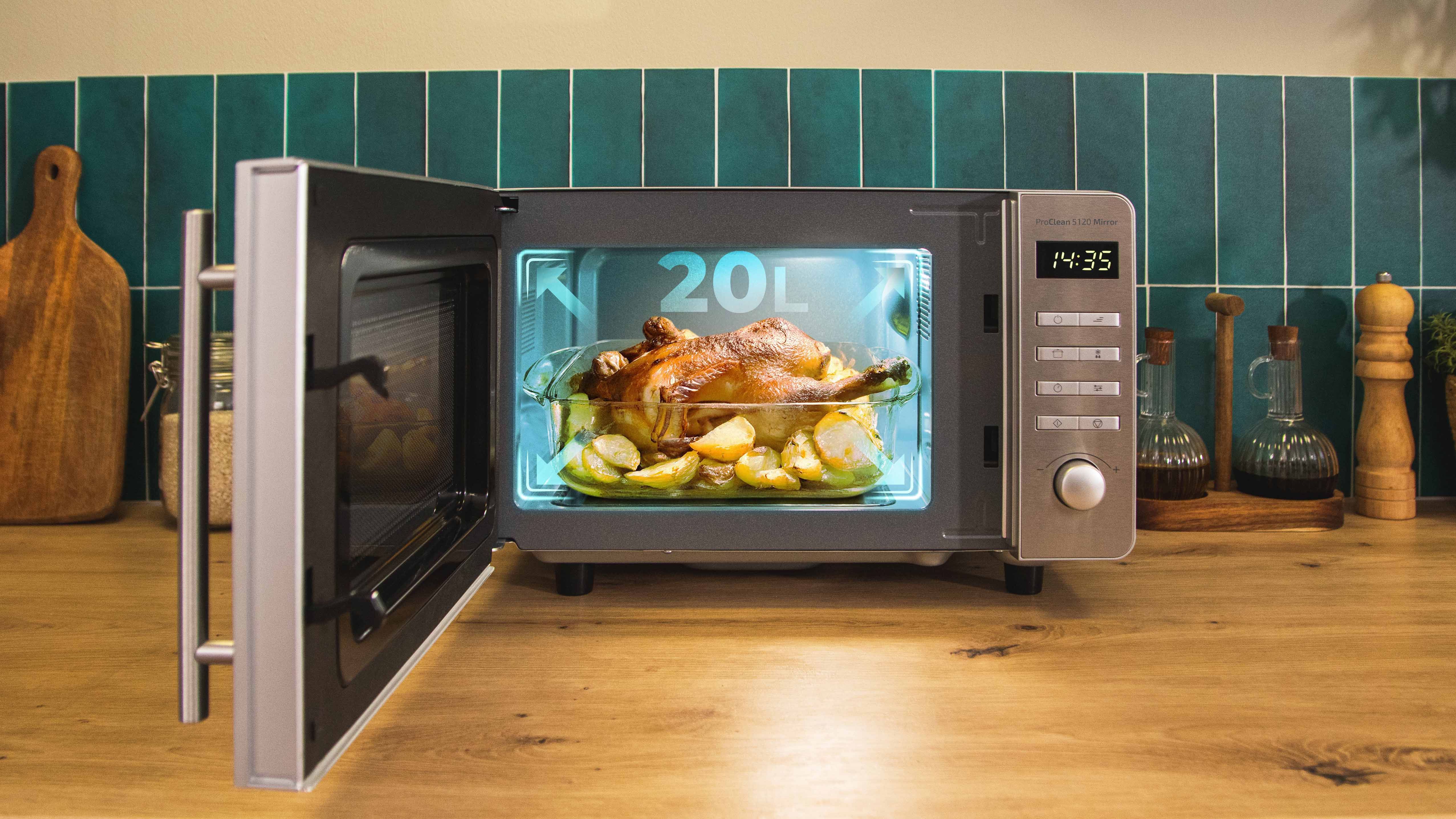 Inteligentna konstrukcja sprawia, że pełne 20 litrów pojemności jest do Twojej dyspozycji. Bez talerza obrotowego możesz swobodnie korzystać z każdego rodzaju naczyń – od standardowych talerzy po duże półmiski i naczynia żaroodporne. Zero ograniczeń, maksimum miejsca do gotowania.