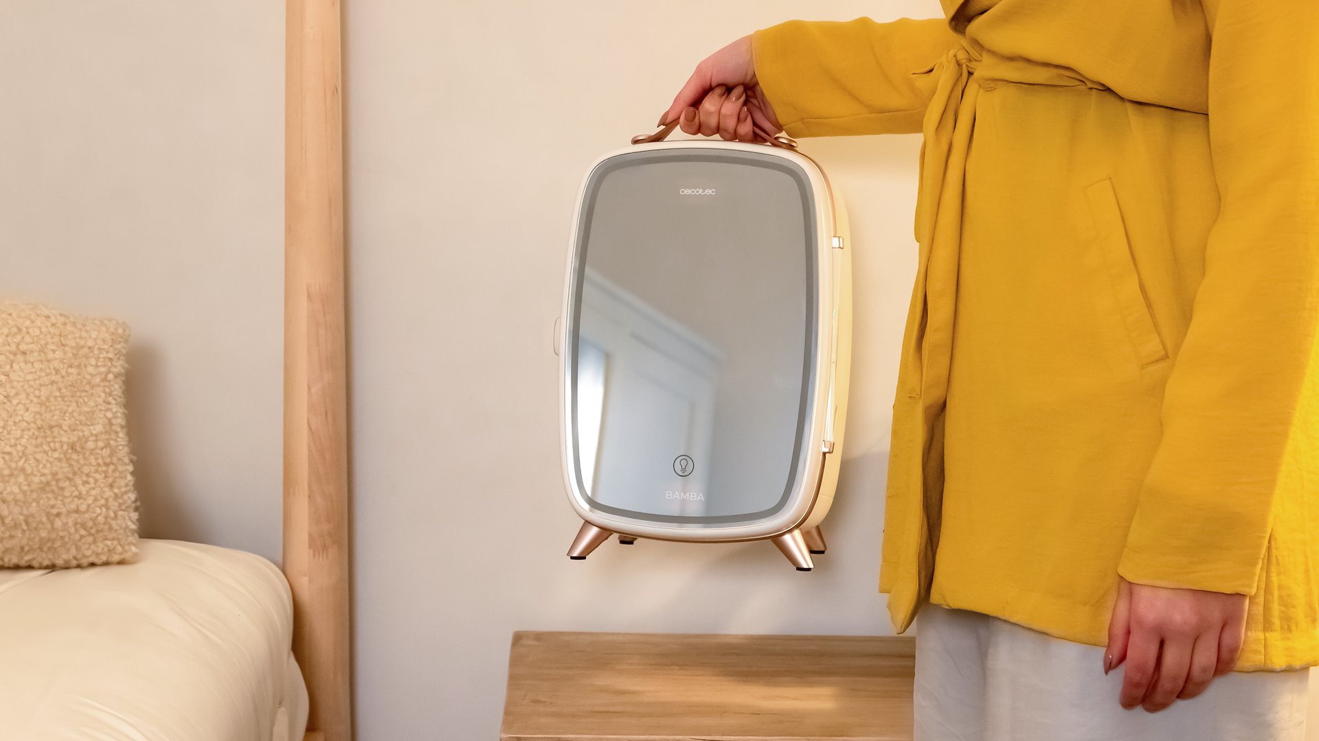 Lodówka COOLINGBEAUTY 6000 MIRROR z wbudowanym lusterkiem ułatwia pielęgnację i aplikację kosmetyków. Kompaktowa, funkcjonalna i estetyczna – sprawdzi się w domu i w podróży.