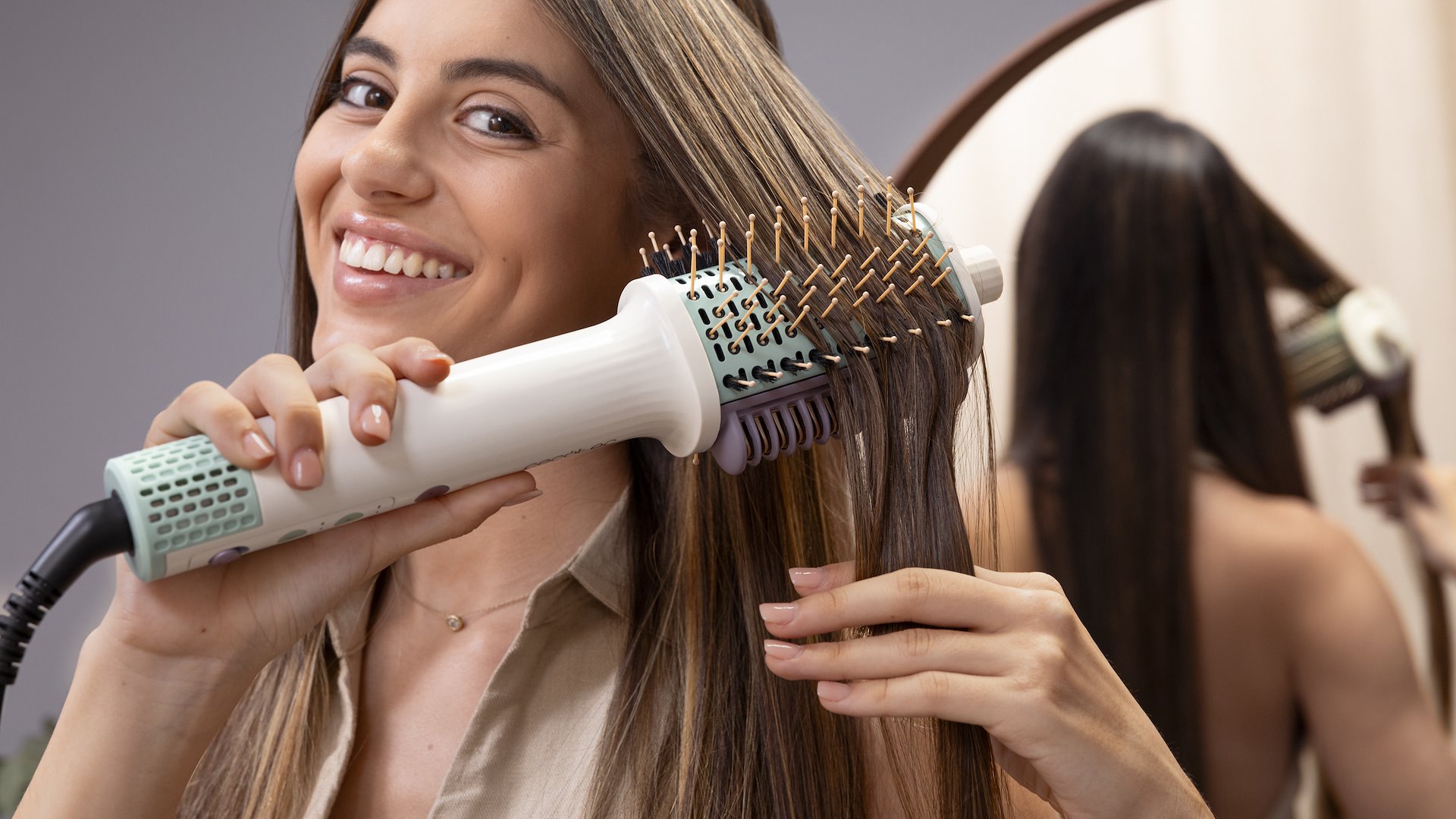 CeramicCare Allin1 kieruje powietrze w boczne szczeliny, by szybko osuszyć włosy. Nie musisz już korzystać z dodatkowej suszarki – jedno urządzenie wystarczy, aby przygotować włosy do stylizacji.